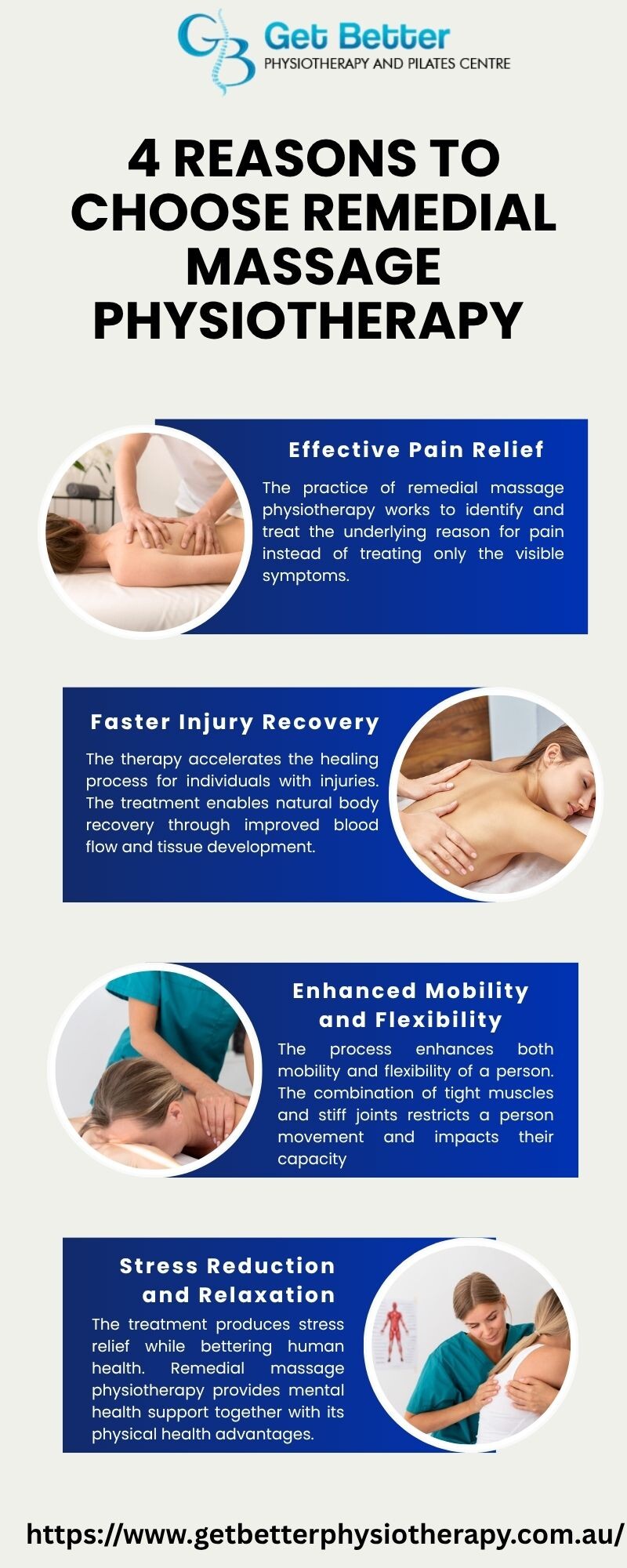 4 Reasons to Choose Remedial Massage Physiotherapy explains how this treatment approach has become popular among people who want complete body health. The Get Better Physiotherapy Centre staff utilizes specific methods to achieve better blood flow and decreased swelling and faster patient recovery.