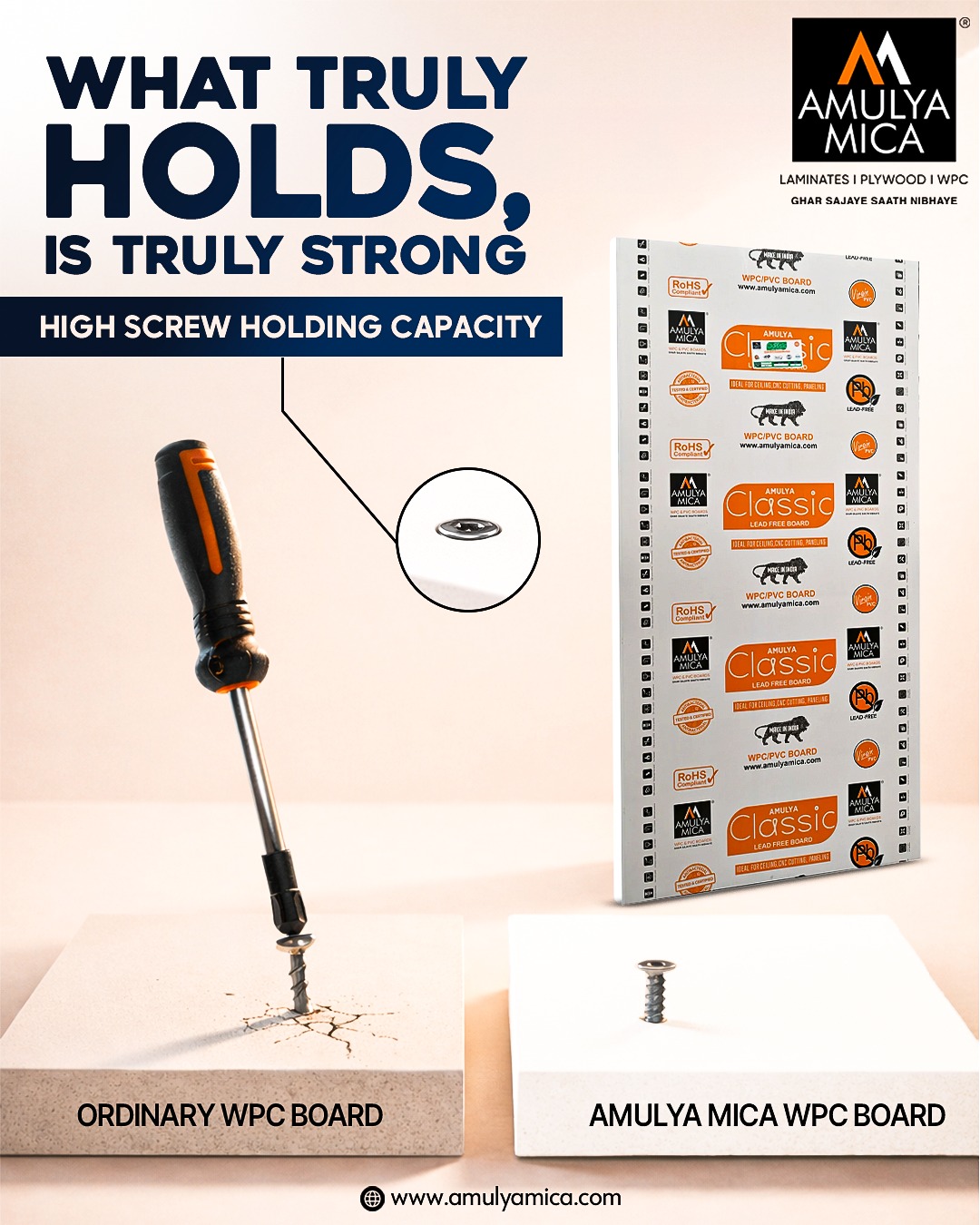 Amulya Mica WPC boards give strong screw holding, better grip and long life.