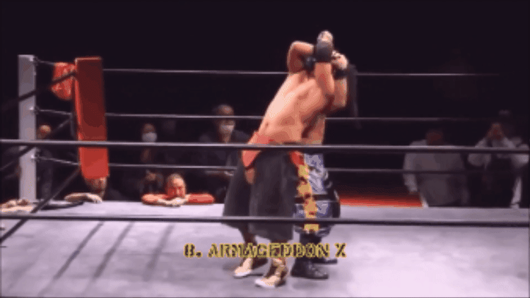 Armageddon X ( STRAIGHT JACKET Gory special lifted and dropped into a sit out spinebuster)