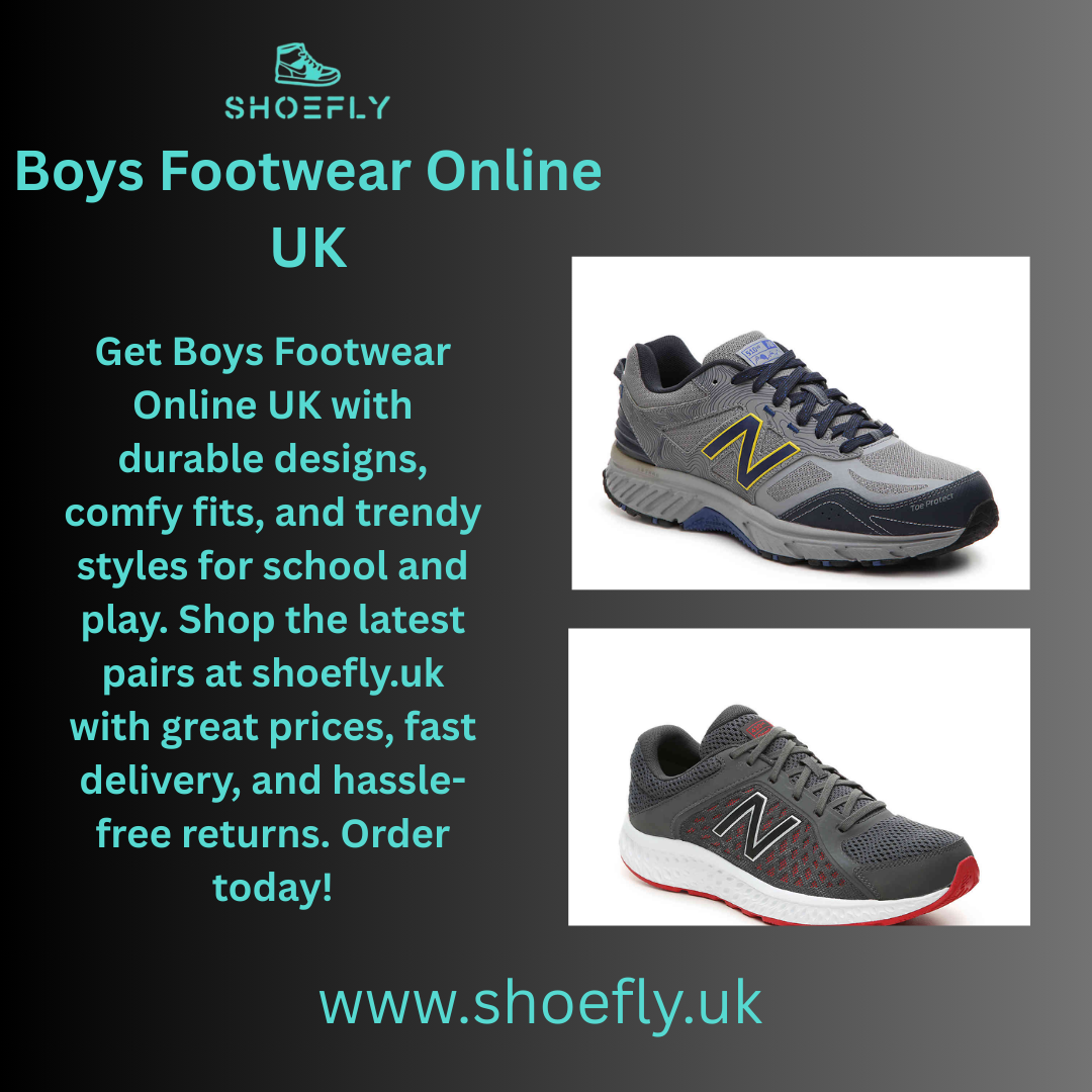 Get Boys Footwear Online UK with durable designs, comfy fits, and trendy styles for school and play. Shop the latest pairs at https://shoefly.uk/ with great prices, fast delivery, and hassle-free returns. Order today!