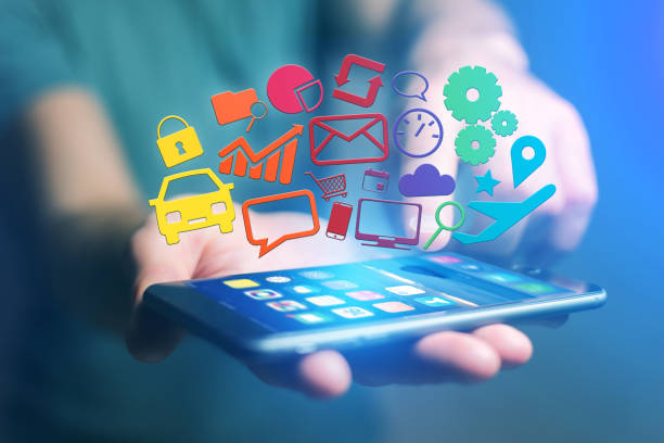 Concept view of creative mulitmedia icons flying over a technology interface - Creativity concept