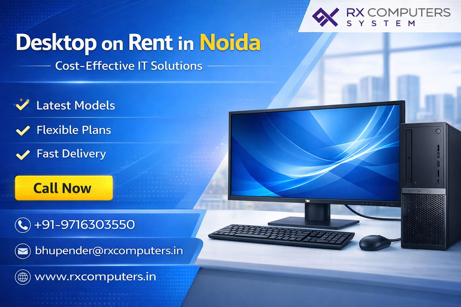 Get high-performance desktops on rent in Noida at affordable prices, perfect for businesses, startups, and events. Enjoy flexible plans, quick delivery, and reliable support tailored to your needs.
