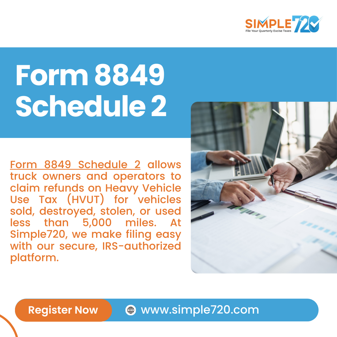 Form 8849 Schedule 2 allows truck owners and operators to claim refunds on Heavy Vehicle Use Tax (HVUT) for vehicles sold, destroyed, stolen, or used less than 5,000 miles. At Simple720, we make filing easy with our secure, IRS-authorized platform. Our guided process helps you submit accurate claims quickly and hassle-free, so you can recover your HVUT refunds without delays. https://www.simple720.com/form-8849-refund-claim/schedule-2
