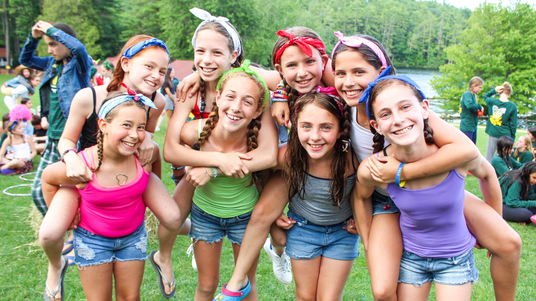 group of girls piggybacking