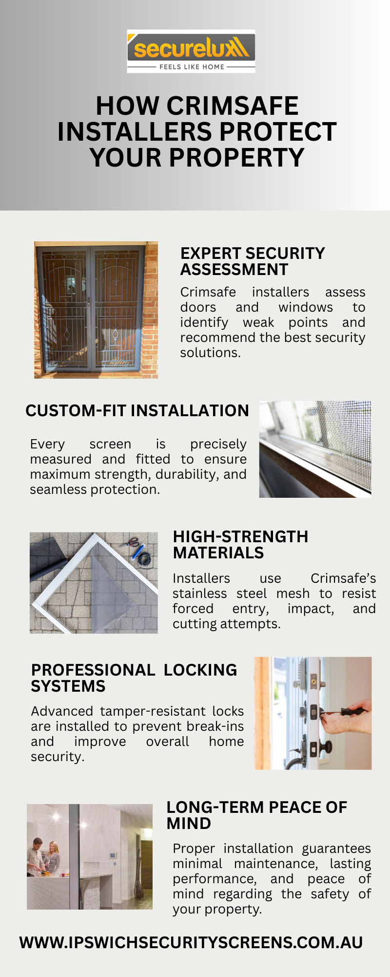 Crimsafe installers protect your property by fitting high-strength security screens that deter intruders without blocking views or airflow. Professional installation reinforces doors and windows, delivering durable protection, safety, and peace of mind.