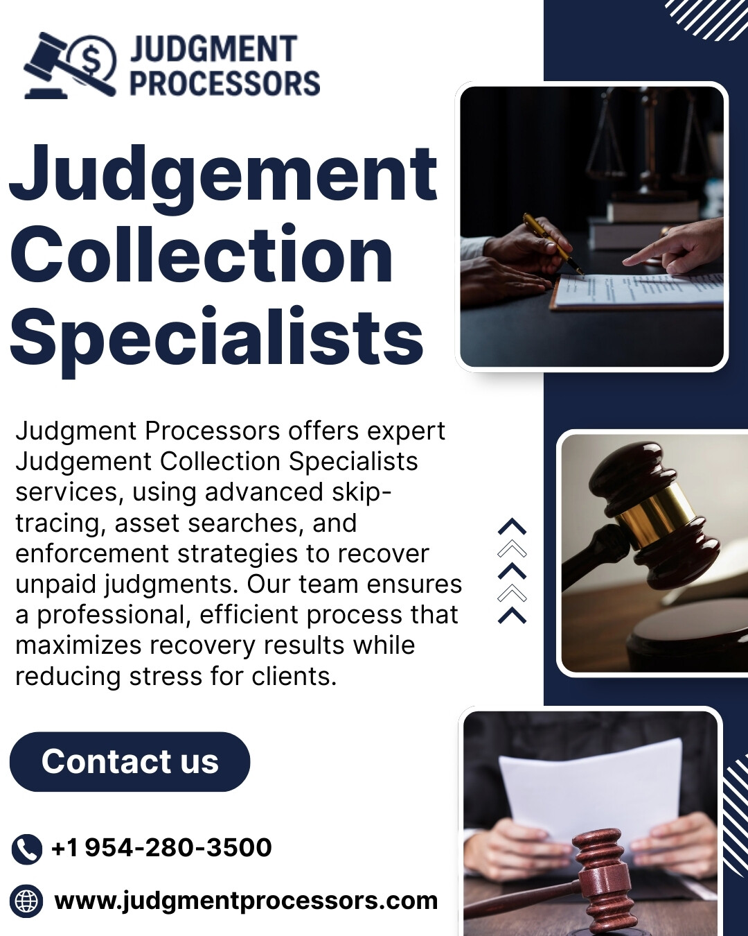 Judgment Processors provides expert judgement collection specialists services designed to help clients recover unpaid court judgments quickly and effectively. Our team uses advanced skip-tracing, asset investigations, and proven enforcement strategies to locate debtors and secure what is legally owed. We handle the entire post-judgment process with professionalism and persistence, ensuring accurate documentation and smooth coordination with legal channels. Judgment Processors is dedicated to maximizing recovery results while reducing stress and effort for our clients. https://judgmentprocessors.com/