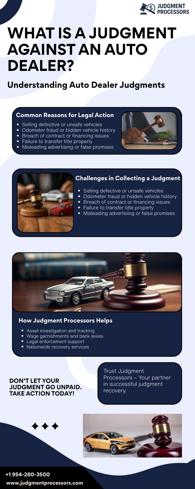 Judgment Processors specializes in handling judgment against auto dealer cases with precision and professionalism. If you’ve won a legal judgment against an auto dealer but struggle to collect, our experienced team works to locate assets, enforce court orders, and recover what you’re owed. We understand the complexities involved in dealer-related disputes and use proven strategies to maximize recovery. With a commitment to transparency and results, Judgment Processors helps turn your court victory into actual financial compensation quickly and efficiently. https://judgmentprocessors.com/judgments-against-used-auto-dealers/