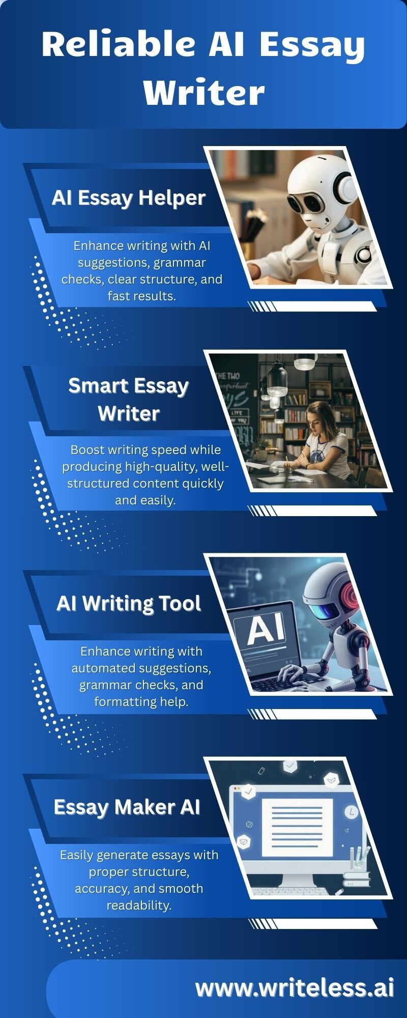 Writeless AI offers a reliable AI essay writer that helps you create high-quality, well-structured essays quickly. Improve grammar, clarity, and flow while saving time with smart AI-powered writing assistance. Perfect for students, professionals, and anyone looking to produce accurate, polished content efficiently. Visit Here : https://writeless.ai/