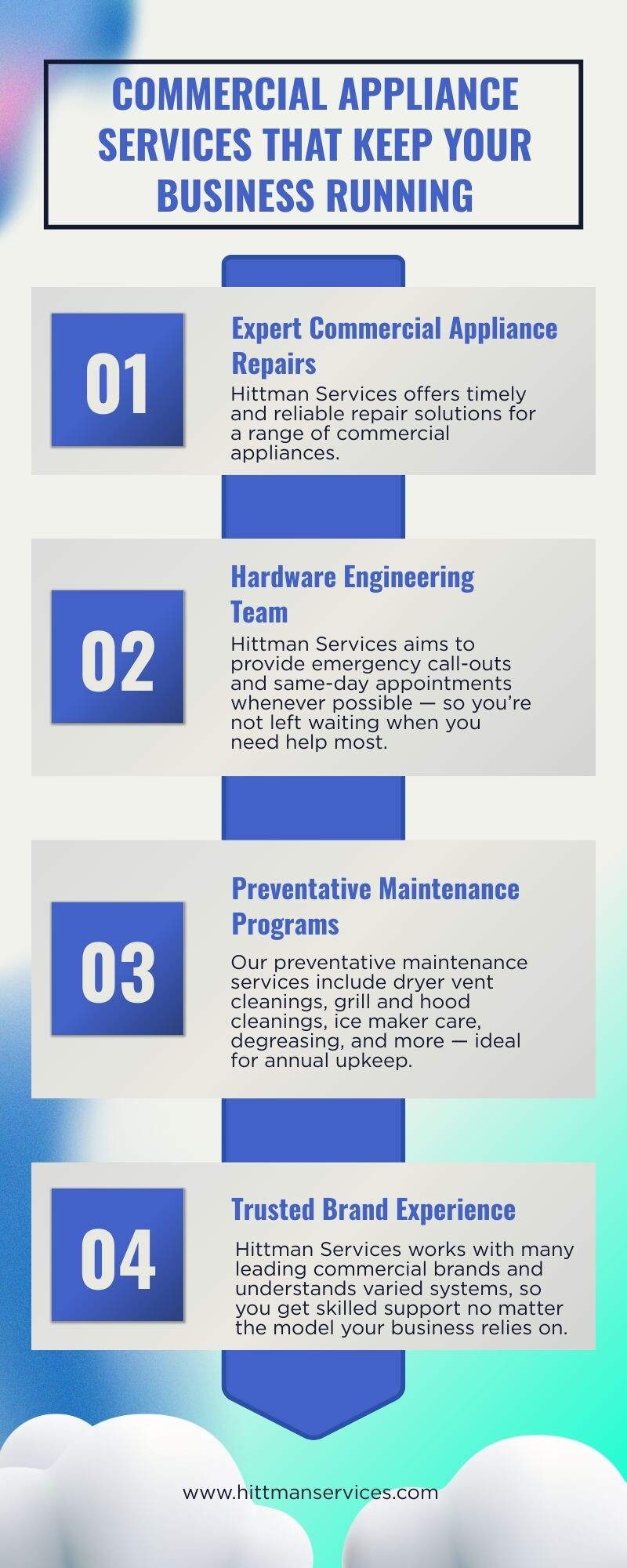 From fast commercial appliance repairs to preventative maintenance, Hittman Services helps businesses reduce downtime and keep essential equipment running smoothly.