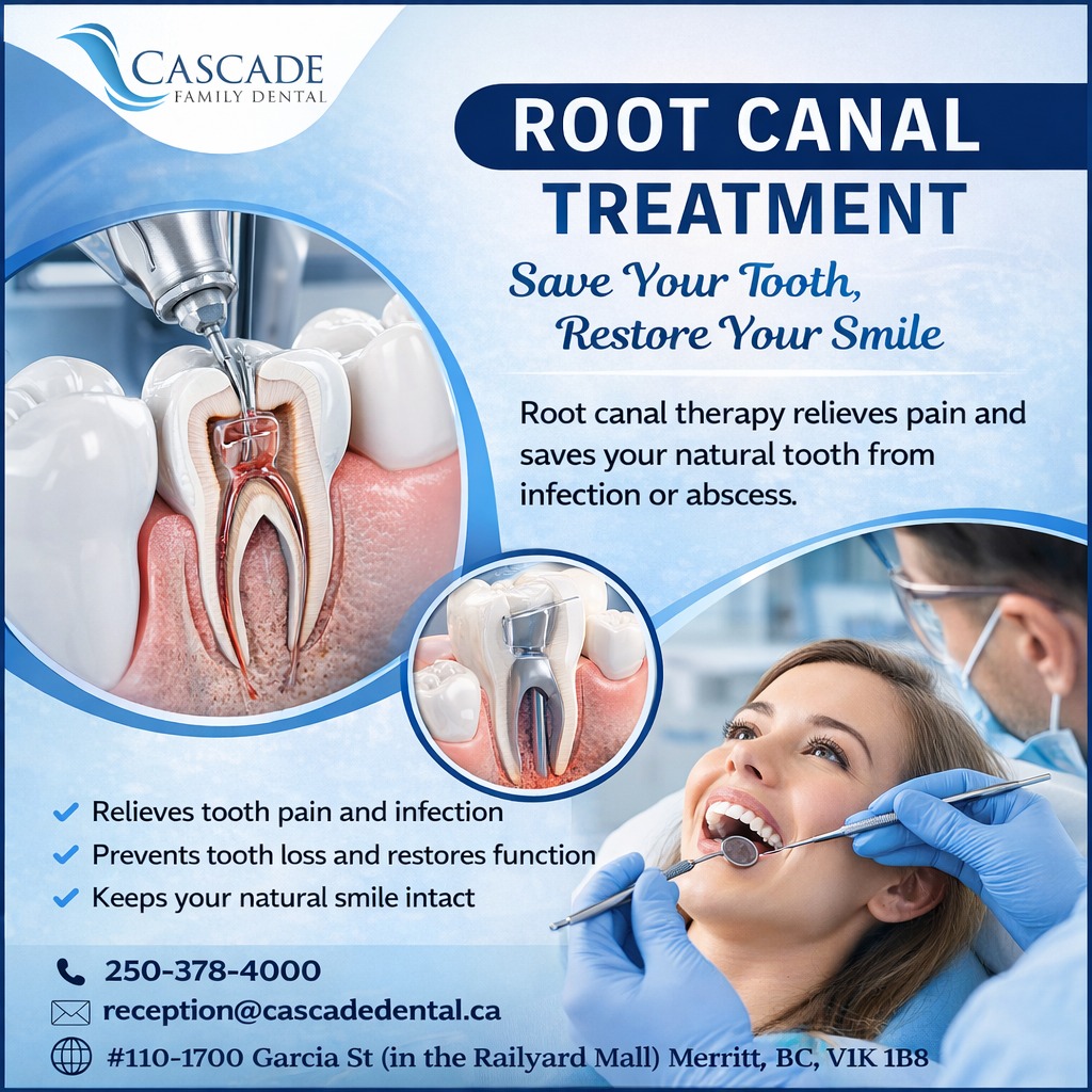 Experiencing severe tooth pain or infection? Cascade Family Dental offers professional root canal treatment to remove infection, relieve discomfort, and preserve your natural tooth. With modern techniques and gentle care, patients in Merritt, BC can restore their smile and oral health while avoiding tooth loss. Early treatment helps keep your teeth strong and functional for years to come.
