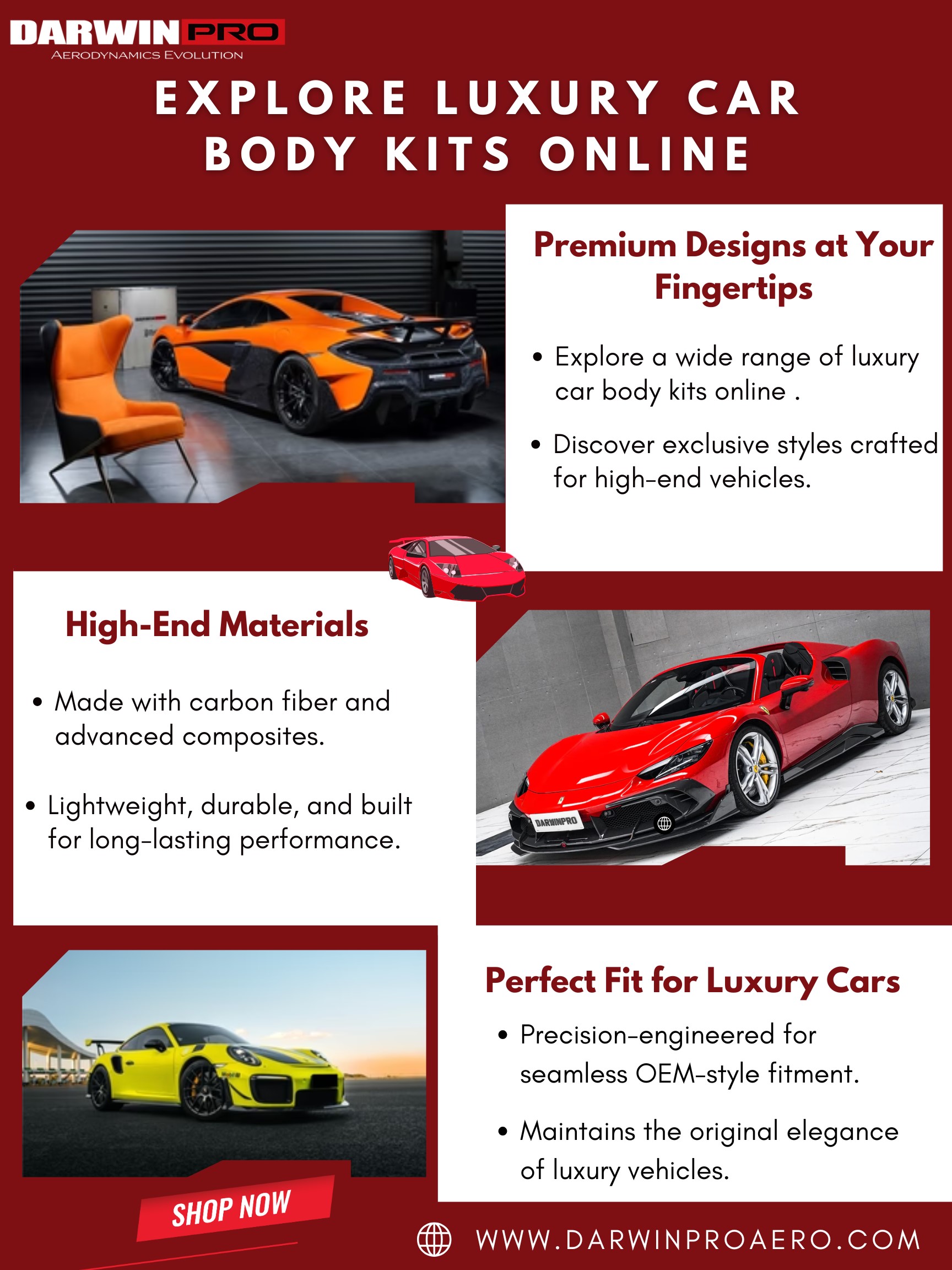 Redefine your car's elegance with our luxury car body kit designed for both aesthetics and practicality. Our high-performance upgrades provide a dominant road presence, aerodynamic efficiency, and streamlined contours. From precision rear diffusers to sculpted front ends, explore high-end options that will enhance your driving experience with speed and sophistication. Shop now! https://darwinproaero.com/