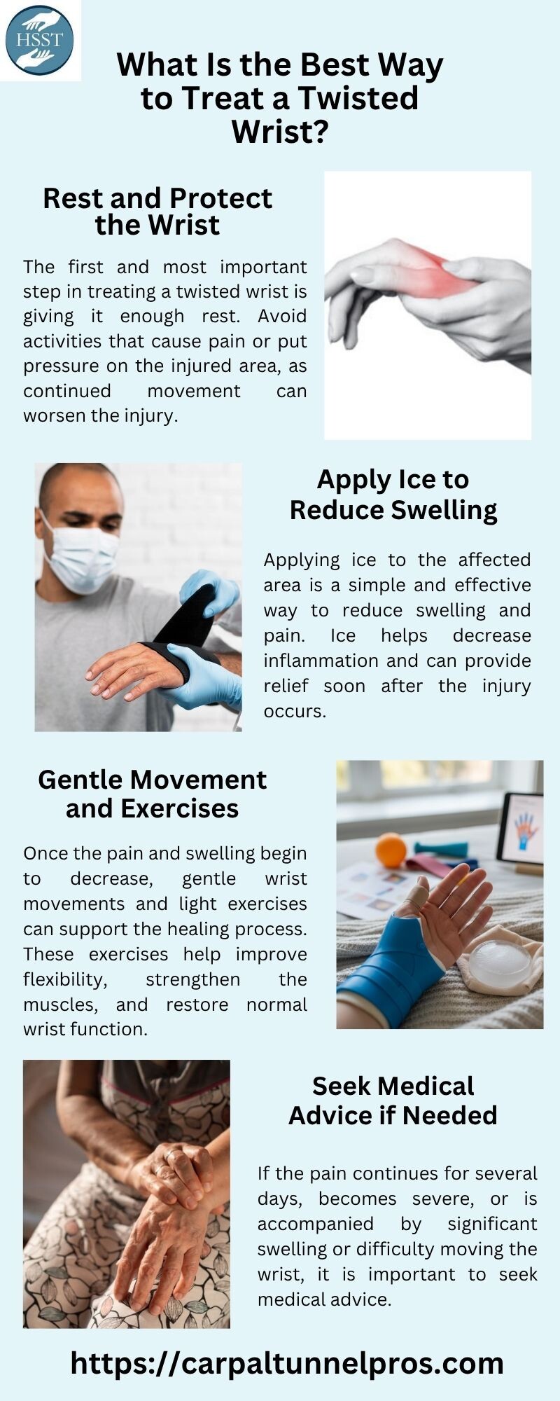 The best way to treat a twisted wrist is to give it proper care and allow time for healing. One of the first steps is to rest the wrist and avoid activities that cause pain or put pressure on the injured area. Applying ice for short periods can help reduce swelling and relieve discomfort, especially during the first couple of days after the injury.